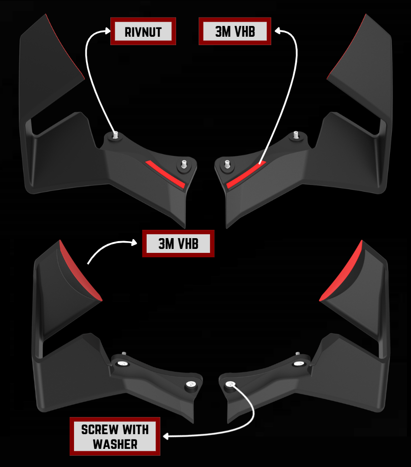 We always look for the best possible fixation in our GP Wings to get the best stability and security in our products, for this we always try to use existing screws on the bike to avoid having to drill fairing, in addition to using one of the strongest 3M on the market.